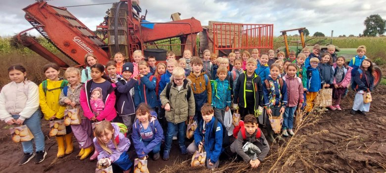 Днес компенсирахме отменената екскурзия от втори клас: Разходихме се до картофената нива на семейство Майер. След като стигнахме дотам, за първи път научихме много за картофите и начина на отглеждането им. Също така успяхме да открием много различни сортове в почвата. След това ни беше позволено да разгледаме отблизо голямата машина за прибиране на реколтата и дори веднъж да се качим на нея. Всеки един от нас събра по една пълна торба с картофи. Утре ще приготвим вкусни картофи за сандъчета и ще им се насладим с ябълков сос и билкова заливка.