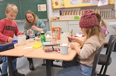As they have done for the past 12 years, Mr. and Mrs. Gartmann were back at our school today to press apple juice together with the first graders and some parents. First the apples were cut into small pieces and then chopped twice before they were put into the juicer. With combined forces, the juice was squeezed out. It was then strained and finally each child was allowed to bottle their own freshly squeezed apple juice.