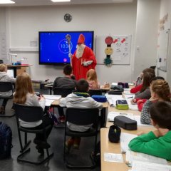 All the students' heads turned towards the door in surprise when Santa Claus made his annual visit to the 5th grades at the Euregio Comprehensive School. In addition to good, St. Nicholas brought with him tongue-in-cheek words of admonition. After a short serenade by the students, he presented them with a small gift.