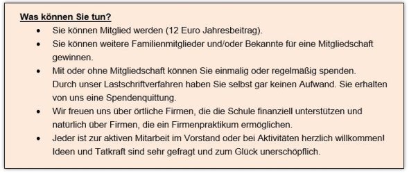Nuestros fondos proceden de las cuotas de los socios, de pequeñas y grandes donaciones individuales y de donaciones para proyectos de la Bürgerstiftung, empresas y bancos, así como de la recaudación de diversas campañas de padres y alumnos.