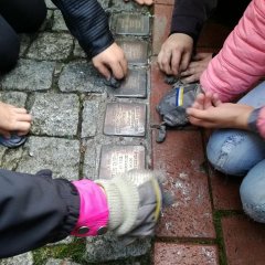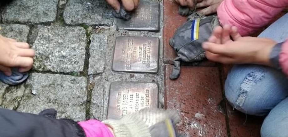 Avec des représentants de la paroisse, quelques élèves ont nettoyé les pierres d'achoppement pour les citoyens juifs dans le centre-ville d'Epe.