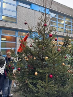 Sekali lagi tahun ini, OSIS mengadakan acara pra-Natal dengan memasang pohon Natal yang sudah menjadi tradisi. Kami ingin menggunakan kesempatan ini untuk berterima kasih kepada Pak Weiß yang sekali lagi menyediakan pohon Natal. Kebetulan, pohon tersebut adalah pohon asli Gronau dalam arti yang sebenarnya. Sama seperti para pembantu yang bekerja keras, termasuk Pak Elskamp dan beberapa murid SV, yang membantu memasang dan menghias pohon tersebut. (BUS)