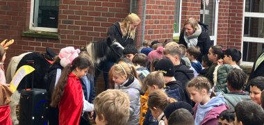 Per questo motivo, alcuni alunni del 2° anno si sono assunti il compito di integrare questa storia nella vita scolastica quotidiana della Grüne-Aue-Schule. Hanno praticato i loro testi e ruoli con grande entusiasmo e ambizione e hanno presentato il loro spettacolo all'intera comunità scolastica dopo la prova generale di lunedì mattina.