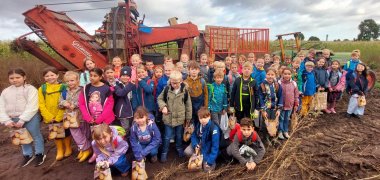 今日は、2回目の授業でキャンセルされたエクスカーションの埋め合わせをした:マイヤー家のジャガイモ畑まで歩いた。そこではまず、ジャガイモとその栽培方法について学んだ。土の中からたくさんの品種を発見することもできた。その後、大きな収穫機を間近に見ることができ、その上に乗ることもできた。一人一人が袋いっぱいのジャガイモを収穫した。明日はおいしいジャケット・ポテトを作り、アップル・ソースとハーブのディップで楽しもう。