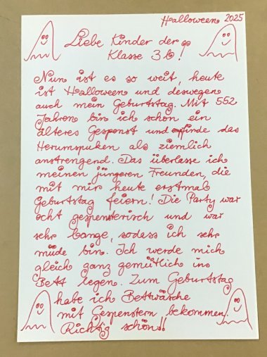 2025年10月、私たちは学校で読書の夕べを企画した。午後6時に大きな校門に集合した。みんな肌触りのいい服を着て、毛布を持っていた。まず、ゲルデス先生、デュースマン先生、ホルトマン先生がアストリッド・リンドグレーンの物語を読んでくれた。最後にみんなでおいしいピザを食べた。