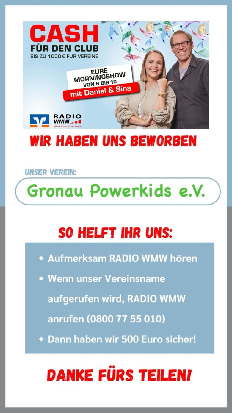 Steun alstublieft onze sponsororganisatie in de "Cash for the Club" wedstrijd in de ochtendshow op Radio WMW!