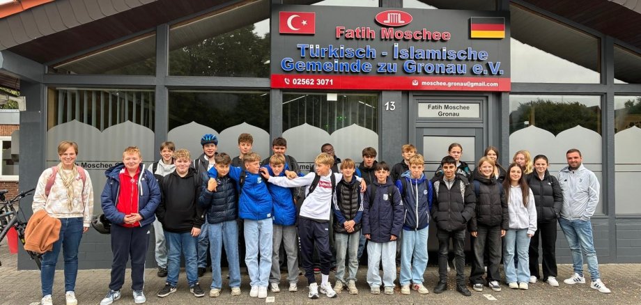 С летних каникул мальчики и девочки из восьмого класса изучали тему ислама. Поездка в мечеть завершила серию уроков. Почти четыре километра до Бургштрассе в Гронау были быстро преодолены на велосипеде, и вот уже класс стоит перед зданием, которое на первый взгляд не похоже на место отправления культа. Три члена исламской общины тепло встретили группу у входа и начали объяснять, что изначально это здание было цветочным магазином, который был переоборудован в мечеть самими членами общины.