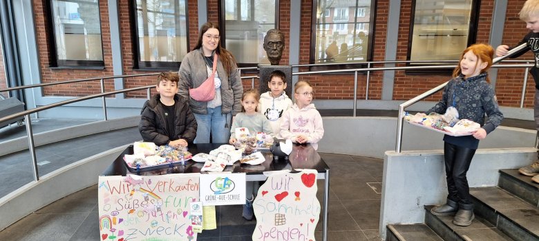 После первой успешной акции по сбору средств в декабре 2024 года "Продажа вафель в строительном управлении Гронау" дети организовали еще одну акцию по сбору средств в центре Гронау. Несколько недель назад группа "Майн-Дей" посетила главное отделение банка Sparkasse. Там состоялась встреча со Штефаном Надиксберндом, региональным менеджером Sparkasse Westmünsterland. В ходе короткой беседы дети рассказали о проекте школы Грюне-Ауэ "Майн-день" и о своей задумке: установить у входа в главное отделение Sparkasse стенд для пожертвований на благие цели. Штефан Надиксбернд сразу же с энтузиазмом воспринял проект и стремление детей и дал свое согласие.