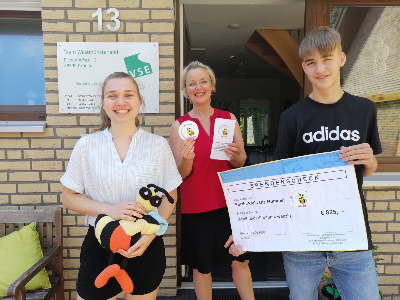 Juliana Terfortová a Justus Odenbach, ktorí zastupovali maturitné ročníky 2020 na Euregio Comprehensive School Epe, odovzdali 825,- eur Simone Reckmannovej, členke podporného združenia "Die Hummel".