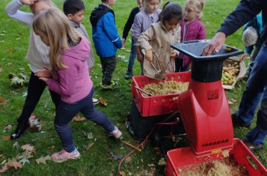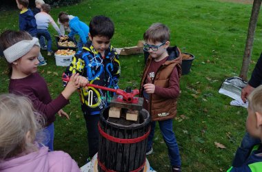 Tako kot že 12 let sta se tudi danes zakonca Gartmann vrnila na našo šolo in skupaj s prvošolci in nekaterimi starši stiskala jabolčni sok. Jabolka sta najprej narezala na majhne koščke in jih nato dvakrat sesekljala, preden sta jih dala v sokovnik. Sok sta iztisnila s skupnimi močmi. Nato so ga precedili in na koncu je lahko vsak otrok stekleničil svoj sveže iztisnjen jabolčni sok.