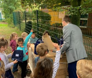 Neben einigen anderen Aktionen, die das Team der Neuen Schule für die Erstklässler*innen in dieser Zeit organisierte, fand am Freitag die offizielle Übergabe des Hochbeetes statt. Dieses wurde der Schule von der Volksbank Gronau-Ahaus gespendet. Die Kinder freuten sich riesig über das Hochbeet und die verschiedenen Gartengeräte, mit denen das Beet im nächsten Jahr bepflanzt und gepflegt werden kann.