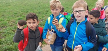 Idag tog vi igen den inställda utflykten från den andra klassen: Vi promenerade till familjen Meyers potatisland. Väl där fick vi först lära oss mycket om potatis och hur den odlas. Vi kunde också upptäcka många olika sorter i jorden. Sedan fick vi ta en närmare titt på den stora skördemaskinen och till och med klättra upp på den en gång. Var och en av oss skördade en påse full med potatis. I morgon ska vi laga goda klyftpotatisar och avnjuta dem med äppelmos och örtdipp.