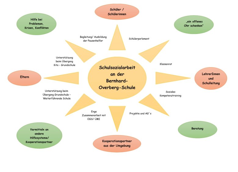 Okul sosyal hizmeti, öğrenciler, veliler ve öğretmenler için açık ve ücretsiz bir hizmettir ve günlük okul yaşamına bağımsız ve kalıcı bir şekilde bağlıdır.