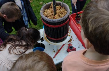 像过去 12 年一样,Gartmann 先生和夫人今天又来到我们学校,与一年级学生和一些家长一起榨苹果汁。苹果先被切成小块,再切两下,然后放入榨汁机。在大家的共同努力下,苹果汁被榨了出来。然后过筛,最后每个孩子都可以把自己的鲜榨苹果汁装进瓶子里。